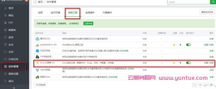登錄寶塔面板,在左側(cè)”軟件管理”里的”系統(tǒng)工具”找到”linux工具箱1.4″,如果沒有安裝,安裝下免費插件,官方的放心使用。