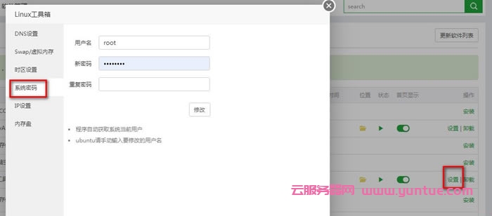 點擊”linux工具箱1.4″右邊的設(shè)置,在里面的”系統(tǒng)密碼”這里更改root密碼了。