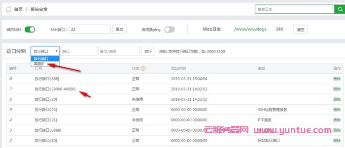 很多時候,有僵尸網(wǎng)絡(luò)攻擊我們vps主機(jī),有人掃描我們主機(jī),這個時候我們就有必要封掉他們的ip。對于寶塔面板來說這個功能實現(xiàn)是非常容易的,依然是在”安全”里的”端口控制”里面選擇”屏蔽IP”然后在后面輸入你要屏蔽的ip或者ip段,右側(cè)有舉例說明,照做就好。