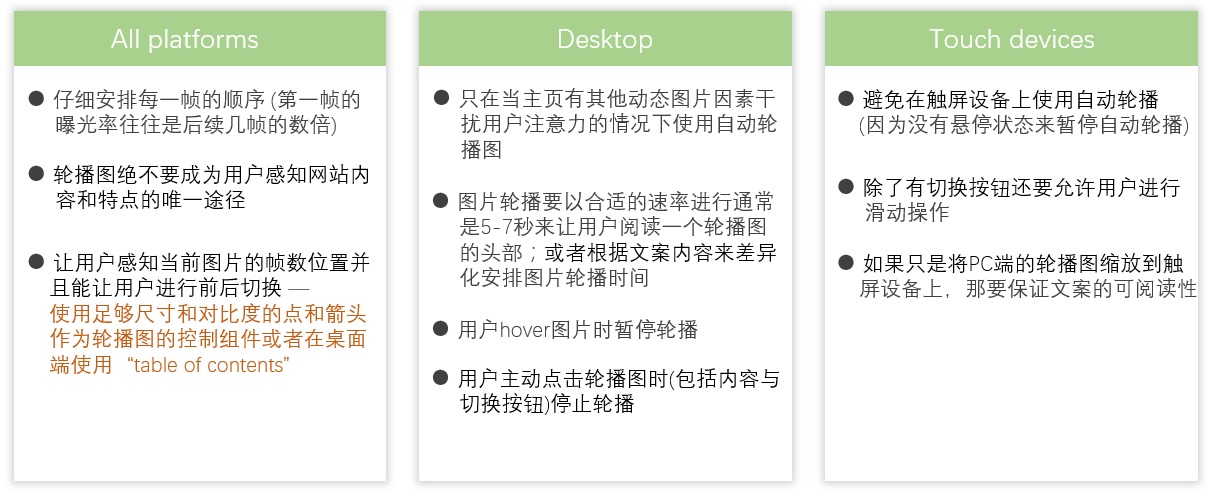當(dāng)用戶主動點擊輪播圖按鈕來看前一幀或者下一幀內(nèi)容時,這種行為是有意進行的并且 (當(dāng)前輪播內(nèi)容)不應(yīng)該被改變,即使用戶決定去查看主頁的其他內(nèi)容。