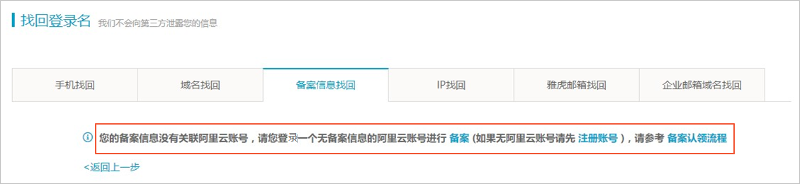當界面能正常跳轉至找回登錄名頁面時,您可以根據界面提示,找回登錄名后直接登錄阿里云ICP代備案管理系統進行備案信息管理。